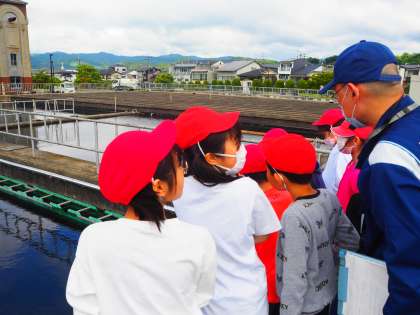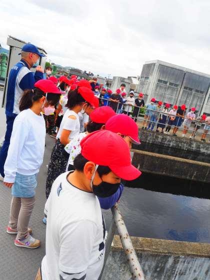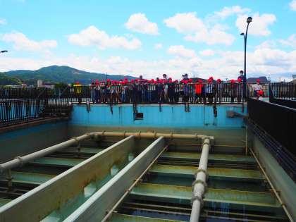 浄水場に到着すると、琵琶湖から届いた水がきれいになる工程の道筋をみんなでいっしょに見学してたどっていきました。実際にためられている水が少しずつきれいになっている様子が目に見えてわかり、子たちも驚いている様子でした。「一日にどれくらいの水をきれいにしているのか」「どれくらいの人が浄水場で働いているのですか」など、疑問に思ったことに関して積極的に質問している姿が見られました。