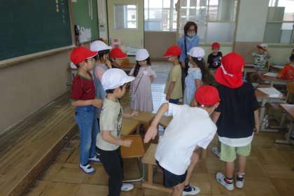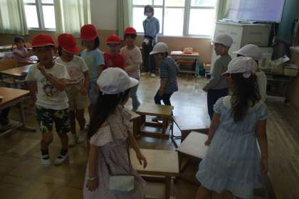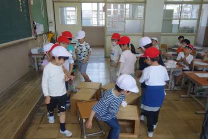 6つのイスを使い、赤白に分かれて、いすとりゲームをしました。