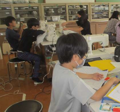 ナップサック作りの工程も少しずつ進み,楽しみにしている人が多かったミシン縫いに入りました。「ていねいにぬいたい。」「まっすぐぬうようにがんばる。」などとても意欲的です。返し縫いするところを確認したり,安全に操作するよう気を付けながら取り組んでいました。