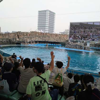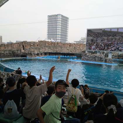 待ち時間に大画面に写って大喜びです。