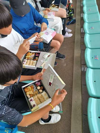 行きのバスから「おなかすいたー」と言ってる人もいました。待ちに待ったお昼ごはん。食べたらグループで館内見学です。