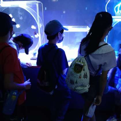 水族館内をグループで見学しています。ぺんぎんの餌やりも見れました。