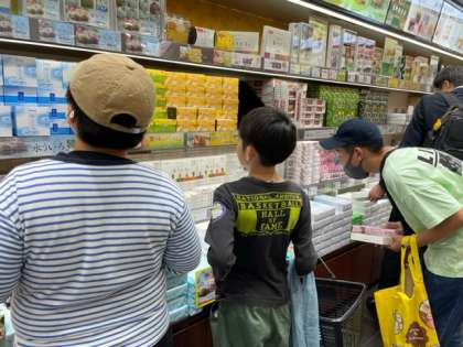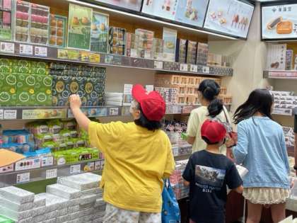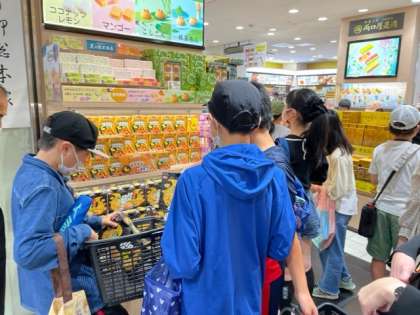 旅館で入館式を済ませて、名古屋駅でお土産を買っているところです。クーポン券とお小遣いを上手に使って、計算して買い物をしています。