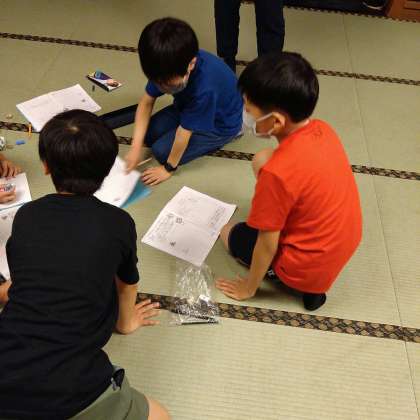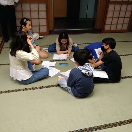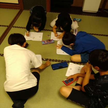 グループごとに、今日の振り返りをしています。明日につながる反省も出し合っています。