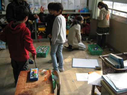 2年生は1組が缶タワー・福わらい・まとあて,2組がブラックボックス・迷路です。