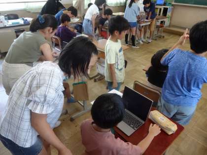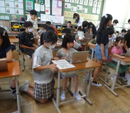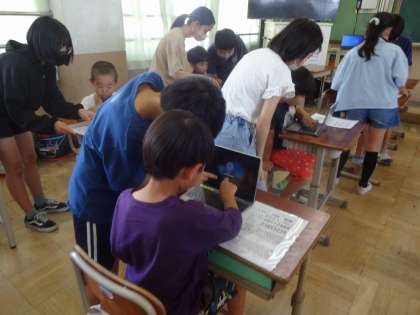 初めて学校のパソコンを操作する1年生に,電源の入れ方やログインの仕方などの操作を教えてあげました。入力する文字を指さしたり,考えながら声をかけたりして6年生として優しく頼もしい姿を見せてくれました。