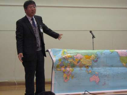 とても不思議な顔をしている人やおかしいと笑ってる人がいますね。知ってるという人もいますね。これらは,どれも「こんにちわ」というあいさつの言葉です。どこの国のあいさつでしょう。世界地図の上で見てみましょう。