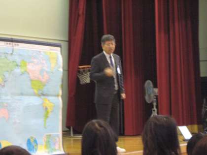 皆さんはどうでしょう。毎月1回は英語の歌を歌ったり,物の名前を英語で覚えたりしています。そして,5年生になると毎週英語を学びます。時にはアメリカ人のマシュー先生がやってきて教えてもらっています。英語で「こんにちわ」はどういうのでしたか。「ハロー」。今度やってくる3人の人に挨拶してみましょう。「ハロー」