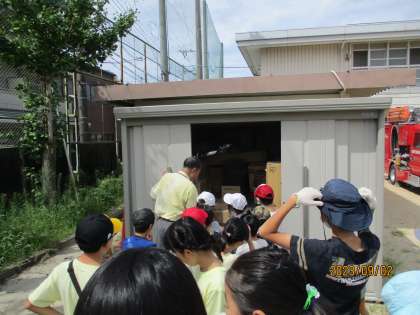 災害時備蓄品が収納されている倉庫の中を紹介していただきました。