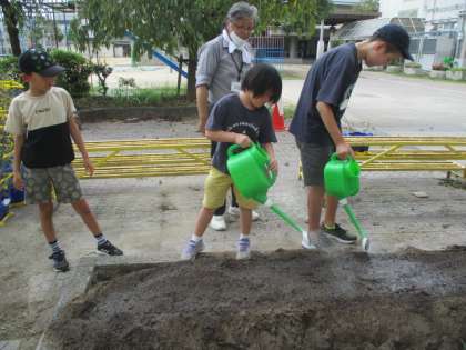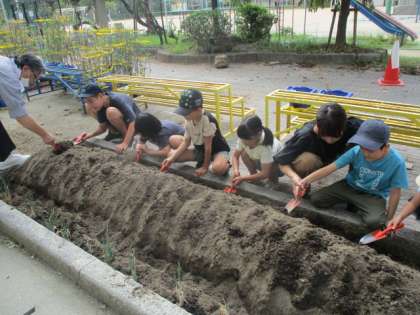 夏にポップコーンを収穫し、空っぽになった大空畑に冬の野菜を植えました。今回は、ネギと大根です。ネギは苗で植えました。大根は、穴に3つずつ赤い小さな種を数えて蒔くことができました!早く芽が出て、大きくなりますように!