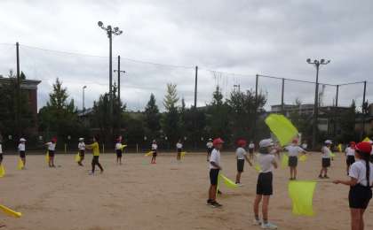 久しぶりに、運動場に出てフラッグの練習をしました。