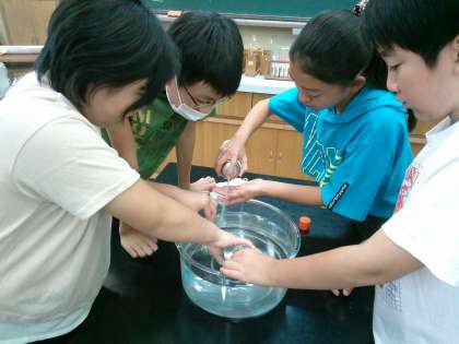 理科の学習の様子です。炭酸水の中から出てくる泡の正体を確かめる実験をしています。