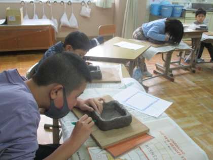 図画工作科の学習で、花器を作っています。1.5kgの重たい土ねんどを粘土版にたたきつけ、両手に力を込めて、柔らかくこねていきました。そして、四角形やハート型など思い思いの形の器を作っていきました。へらやビー玉、ストロー、竹串などを使って、色々な模様をつけました。焼きあがってどんな作品になるのか楽しみですね。