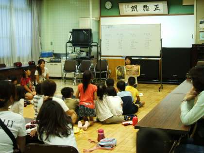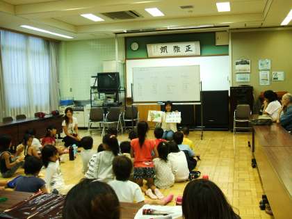 夕方6時半,続々と懐中電灯を片手に40名近くの人が親子で集まってきました。まず,多目的室1で,セミのお話を聞きました。