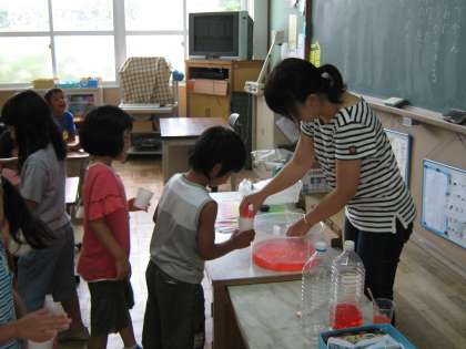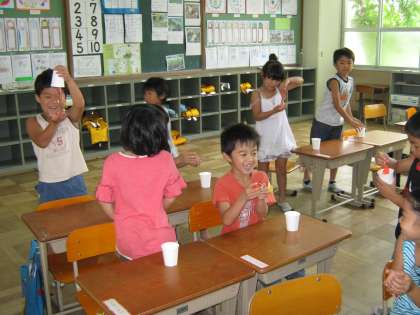 1年生は,登校日に「むかしばなし」のビデオを観たり,スライムで遊んだりしました。