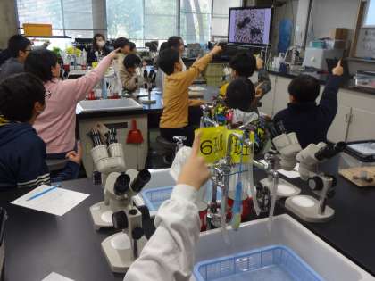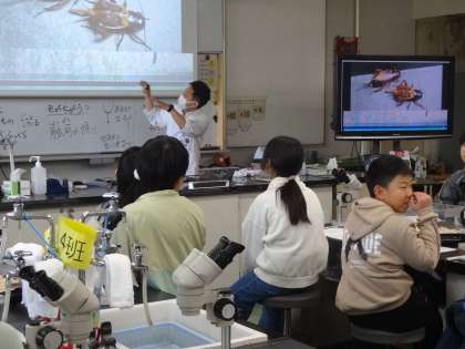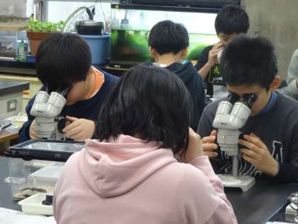 6年生の科学センター学習「生物」では『なき虫のヒミツ』の学習をしました。フタホシコオロギの観察から始まり音のなるヒミツをさぐっていきました。羽をこすっているというの知っているのですが、「メスとオスでは違いはちがうのかな。」「どうやって音がなるの?」「その音はお互いに聞こえているのかな。」といった疑問をどんどん観察し解決しました。実際に私たちの身の回りにある「くし」「下敷き」などを使ってフタホシコオロギの音の出し方をやってみました。羽には『ヤスリ器』と『コスリ器』があることを顕微鏡で発見し謎が解けました。カブトムシやセミ、シロアリも音をだしているということを知ってみんなで驚きました。とてもすてきな発見がたくさんありました。ぜひ、話を聞いてみてください。