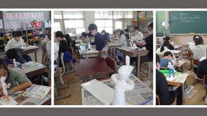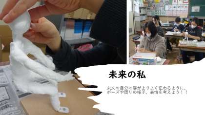 10年後20年後の自分の姿を思い浮かべて粘土を使ってその様子を表現する学習をしています。職業を思い浮かべたり、こんな風に生活していたいなと夢を思い浮かべたりして作っています。未来の自分の姿がより伝わるようにポーズや顔の表情などを考えています。