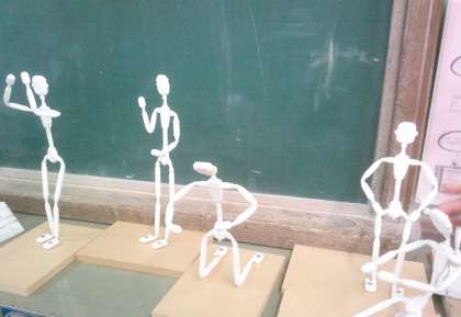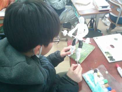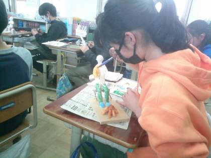 図画工作科の学習で10年後の20年後の自分を想像して、立体作品を制作しています。骨組みだけだったところからポーズが決まり、紙粘土で肉付けをし、色を塗っているところです。どんな作品が並ぶか楽しみです。