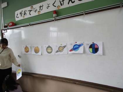 惑星を思い思いの色に塗って、興味を掻き立てていました。