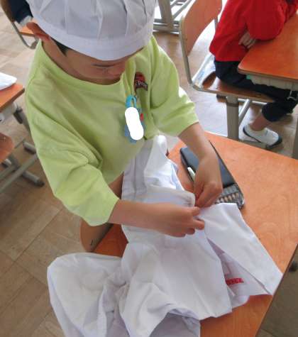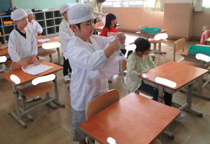 今日は、栄養教諭から給食の準備の仕方や正しい食事の仕方について学びました。