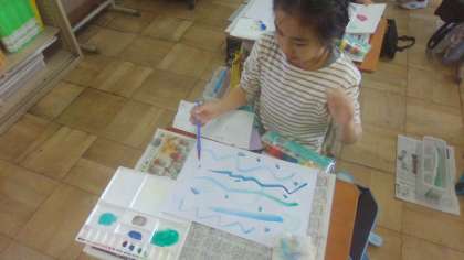 絵の具と水のバランスを試しながら、すうっと筆を動かしたり、トントンと筆をついていったりして、真っ白の画用紙に楽しい絵の具の世界をつくっていきました。
