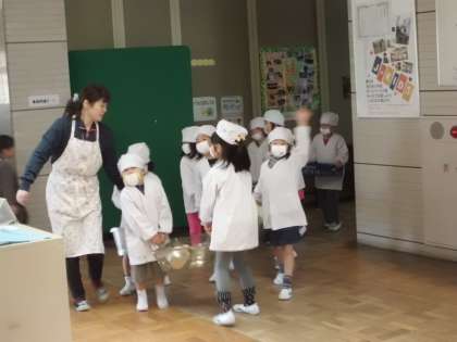 手を洗って消毒して,おかずや食器,牛乳の係に分かれて運びました。