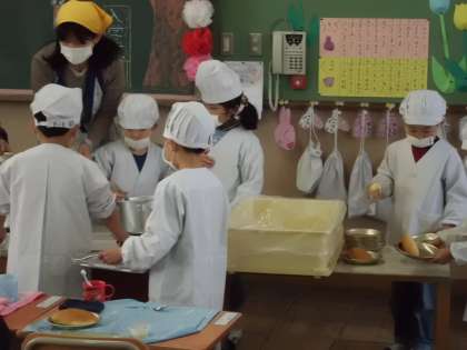 教室では,先生が給仕したおかずやパンを,落とさないように気をつけて配りました。