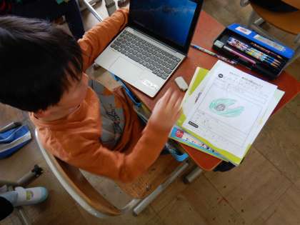 教室へ戻って、観察カードに、生き物の特徴と気づいたことをまとめました。