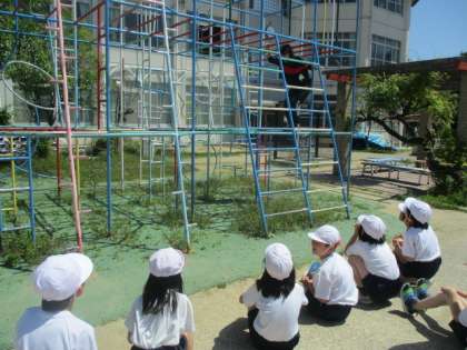 体育科の学習では、遊具あそびが始まりました。総合遊具やジャングルジムの正しい使い方を学習して、安全に楽しんでほしいと思います。友だちが登っているところを見て、良い登り方を見つけたり、先生のお手本をよく見て危険な登り方の時には、「危ない!」と判断することができました。