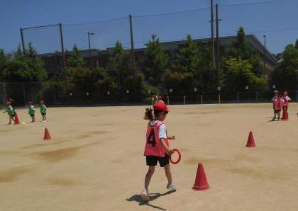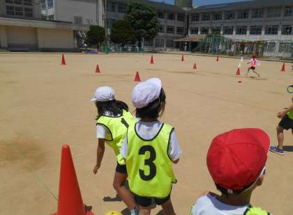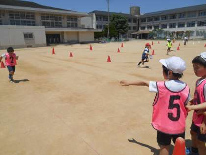 今日は、3回目のリレーあそびをしました。準備や片付けにも慣れてきて、対決もたくさんすることができるようになりました。コーンをコースにおいて、くねくね曲がりながら走ったり、コーンの周りを一周しながら走ったりして、リレーあそびを楽しみました。コーンを一周回るのは難しそうでしたが、早く回るためのコツをチームで話し合う様子も見られました。チームで協力しながら、リレーあそびを楽しんでほしいと思います。