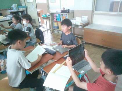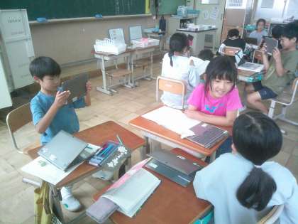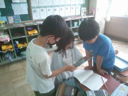 国語科の学習の中で、友達が話したい話題について質問をしていき友達のまだ知らない秘密の魅力を聞き出そうとしています。インタビューの様子をGIGA端末をで動画に撮っています。撮影した動画を見ながら、良い聞き方について考えています。