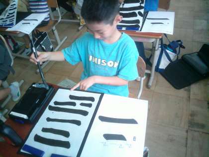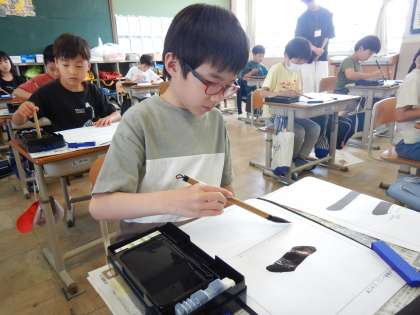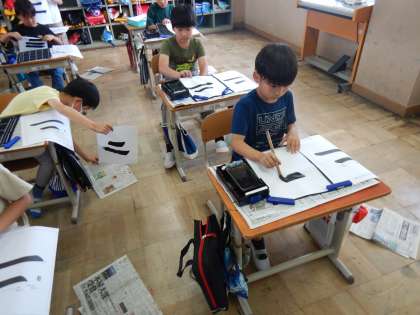 前回の学習を復習し、始筆・送筆・終筆の筆の穂先の向きも確認しました。