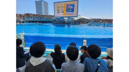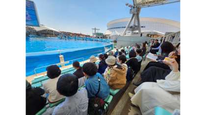 イルカたちのウォーミングアップですでにテンション上がってます。