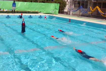 2回連続雨天でプールに入れなかった4年生。今日は晴天の青空の下、やっと入ることができきました。準備体操から元気な掛け声が響き、楽しみな気持ちが伝わっていました。耳の後ろでしっかりと両手を伸ばして泳ぐことなどに気を付けながら、自分のめあてを持ち、コースに分かれて泳ぎました。「うまい。」「いいよ。」「がんばれ。」など応援の言葉を受けながらがんばっていました。