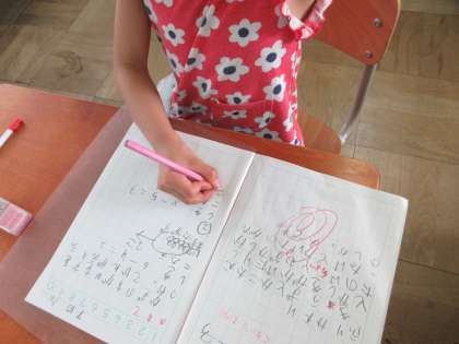 引き続き、問題を読んで、式・答え・図・ブロックを使って考えています。