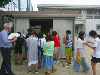 地域の方や区役所、消防署の方に来ていただき、学校の防災倉庫や簡易トイレを見学させていただきました。