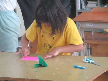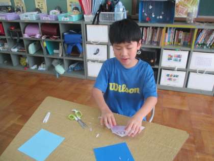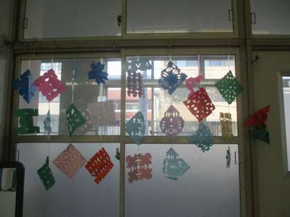 折り紙で折った形にはさみを入れて、開いたときにどんな模様になるかを楽しみました。廊下の窓のところに吊るして、涼やかなモビールのようになっています!