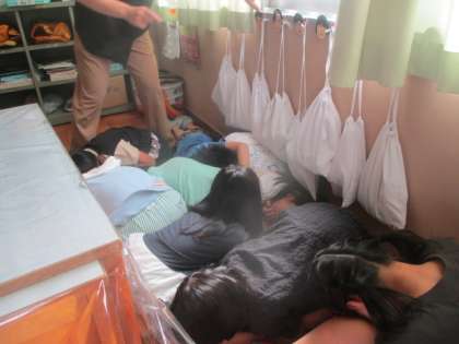 もし、不審者が学校に入ってきた時、すぐに避難ができるように防犯訓練を全校で行いました。大空学級の子どもたちもみんな真剣に話を聞き、教室の隅にかたまり静かに隠れることができました。