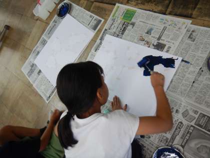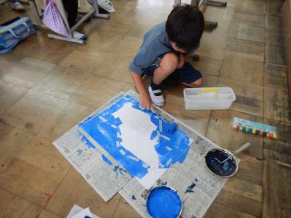 ローラーを使って、背景づくりをしたり、クレパスを使って、目立たせるところを作ったりしています。