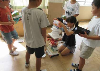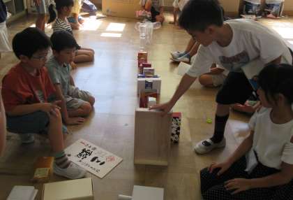 生活科では「あそんで ためして くふうして」の学習をしています。はじめは廃材を使用して、積んだり、転がしたり、並べたりして遊びました。どちらが高く積めるか勝負したり、みんなでドミノをしたりしながら、どうすれば高く積めるかな?どの廃材だと倒れやすいかな?と相談する姿が見られました。