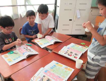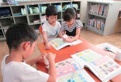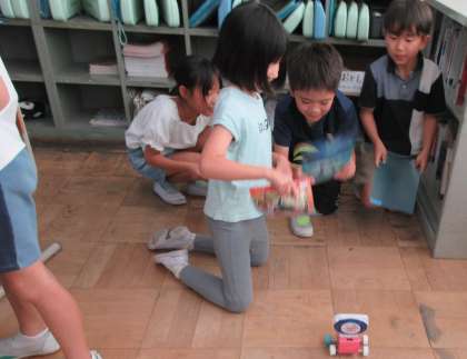 廃材でいろんな遊びを体験した後は、動く仕組みの¥があるおもちゃを作って遊びました。高く飛ばすために工夫したり、ロケットの飾りつけをしたりして楽しむ姿が見られました。車のおもちゃでは、机の上にコースを作ってグループで協力する姿が見られました。
