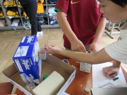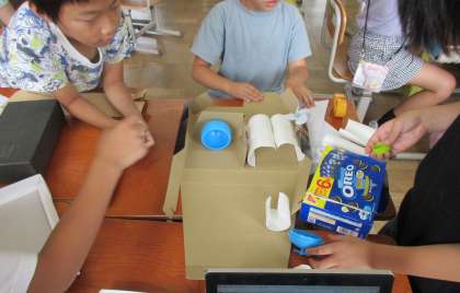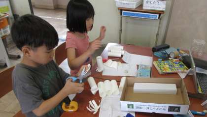 廃材を利用したおもちゃで楽しみ、次は自分たちで遊びを考えておもちゃを作る活動を行っています。本で遊びを調べながら、みんなに楽しんでもらうために試行錯誤する姿が見られます。グループで話し合いながら、より楽しいおもちゃを目指していってほしいと思います。