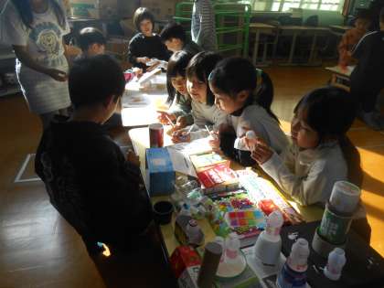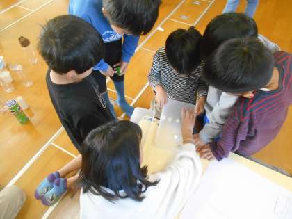 先週の金曜日にグループで作ったおもちゃで楽しむ交流会を開き、学年のみんなで楽しみました。