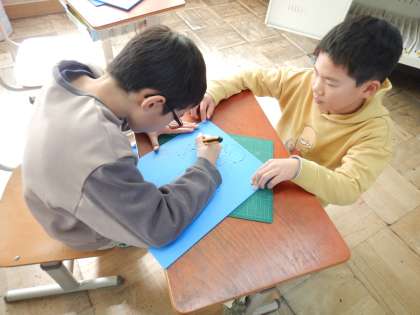カッターを使ってスチレンの板から、切り離して版に色をつけていきました。