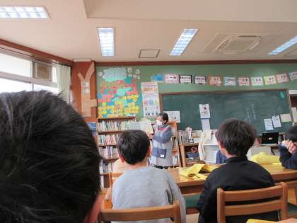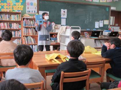 冬休みに借りた本を返却しに図書室へ行きました。読み聞かせをしてもらい、絵本の真似をしながら楽しむ様子も見られました。これからもたくさんの本に親しんでほしいと思います。