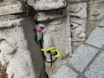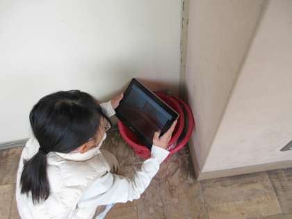 作った後には、【すきま探しのプロ】になり、学校中のいろいろなすきまにすきまちゃんをおいてタブレットで写真を撮りました。