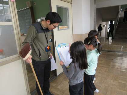 1年生に学校内を案内するために先生方に教室や特別教室の使い方をインタビューしています。