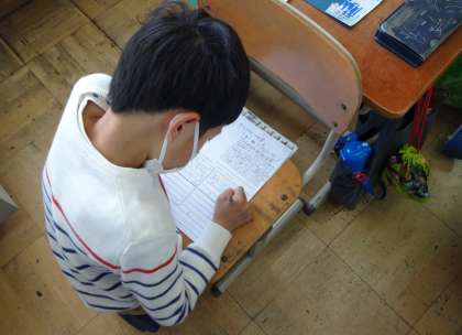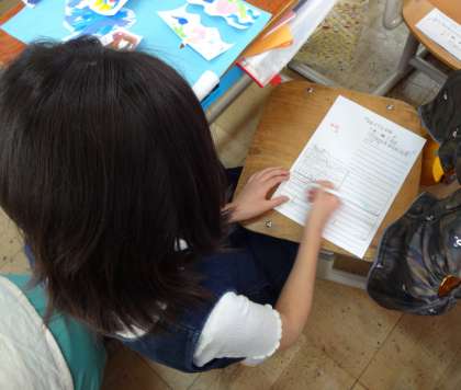 静かな空間で、友達の作品の工夫したところを見つけてコメントを書きました。