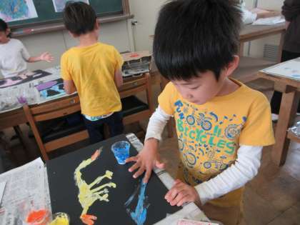 どろっとした絵の具を見て大盛り上がりの子どもたち。