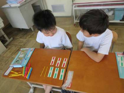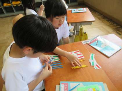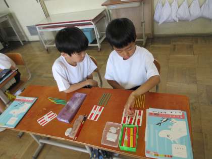 ペアで数え棒やカードを使って、どう変化するかを考えました。